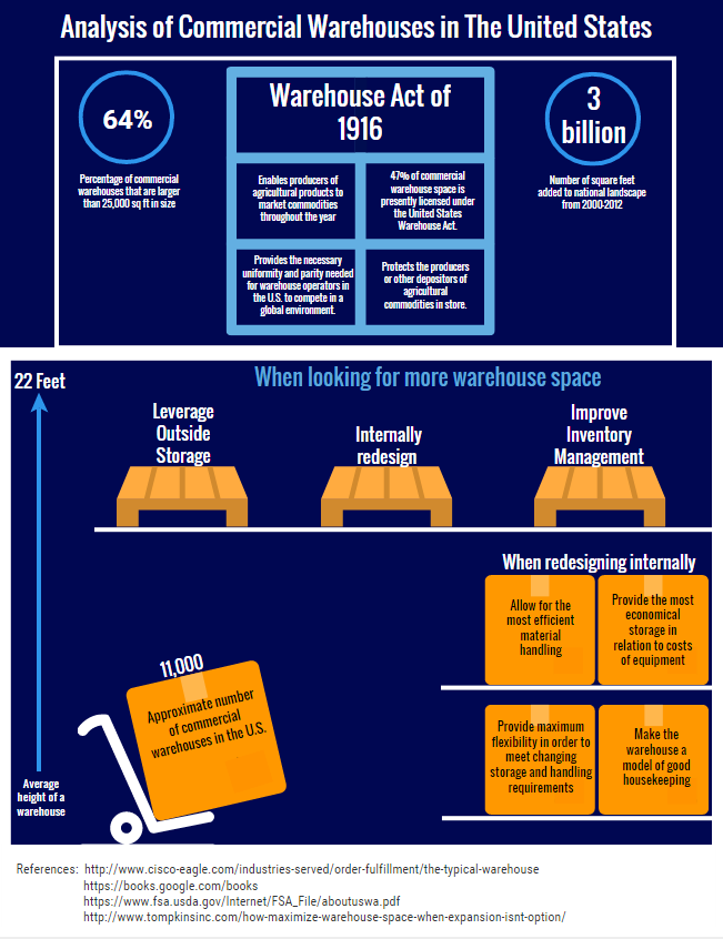 An industrial and functional piece of content that reflects the industry and publisher. Warehousing in the United States is a large commercial sector of business and the Analysis of Commercial Warehouses in The United States infographic covers the Warehouse Act of 1916 and input for managing a warehouse space. Information on how prolific warehouses are today in the US and many of the challenges they face in the modern era.