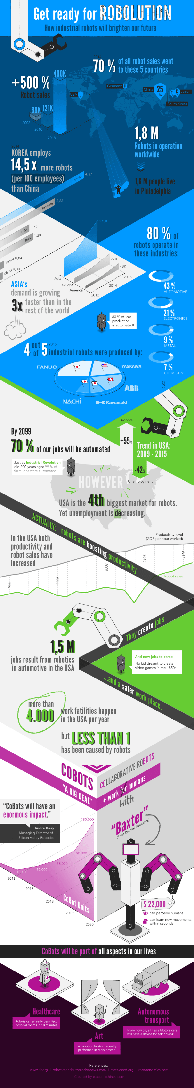 Get Ready For Robolution infographic from TradeMachines covers the topic of how robots will brighten our future by undertaking all the menial tasks of the world. Please, if anyone can send me a bathroom cleaning robot I will be most appreciative.