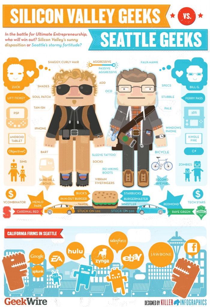 Nice observation of Geeks in Seattle and Silicone Valley (are there any others?). Is it me or does the SV geek look like Chris Brogan and the Seattle Geek looks like Bill Gates on a major dress down? Really great illustration – bit thin on data but the personification of geek vs geek makes it worth it.