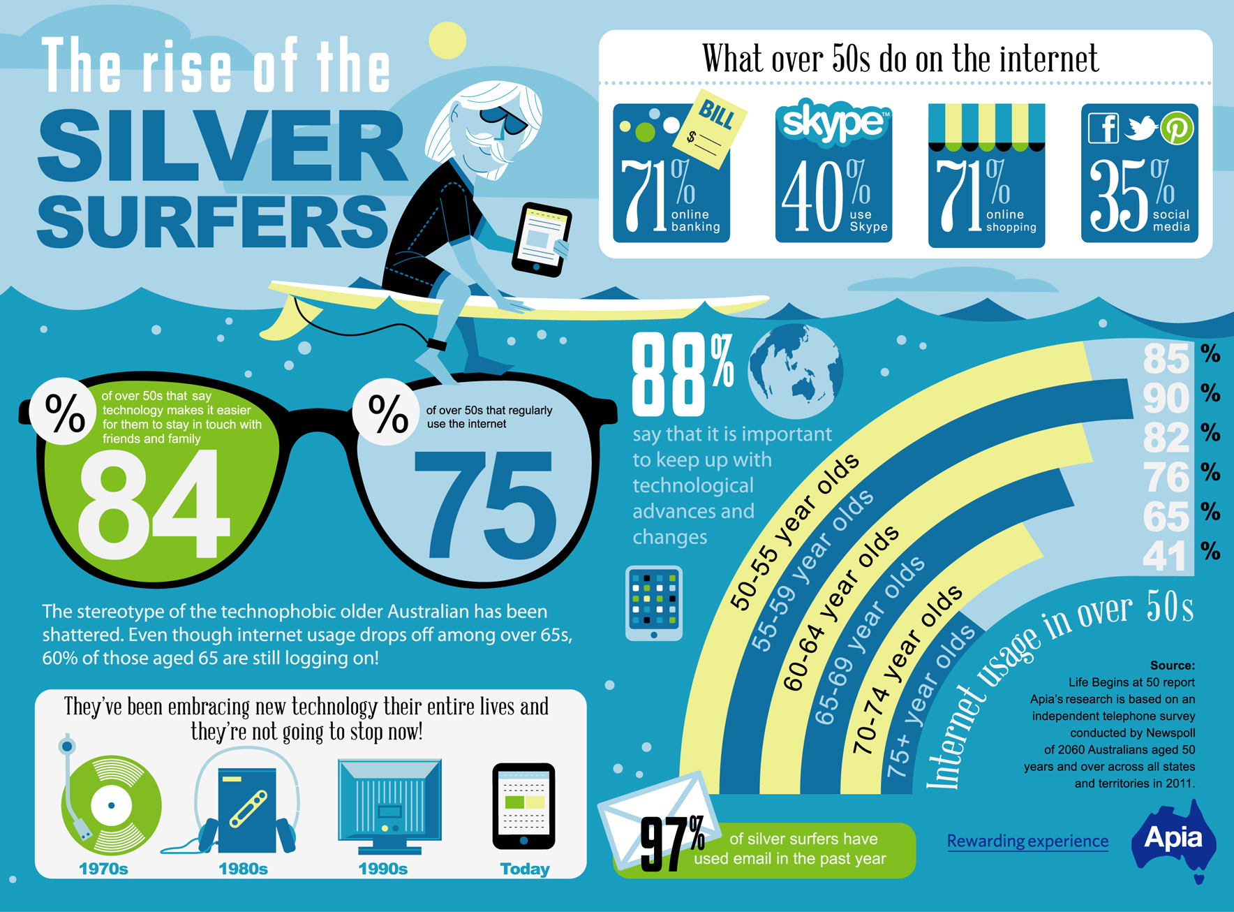 The over-50 crowd of today is nothing like previous generations. Retirees and boomers right now are far more active, more involved, and better with technology than their parents or grandparents were and business and service providers are moving to keep up with them. If your idea of a pensioner is a grey-haired woman sitting in a rocking chair, you need an update. She and her friends are getting involved in all types of activities and they have interests that would surprise you.This infographic from apia.com shows the rise of the silver surfer…
