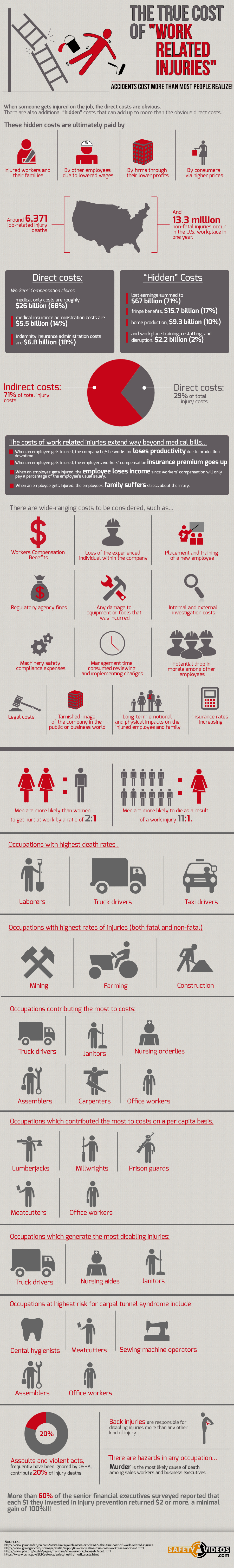 Do you know what it costs and how many different people are affected when someone gets hurt at work? This graphic from Safety Videos outlines those who get hurt and those occupations which face a higher hazard than the normal job. When an accident at work happens, the employee faces an immediate financial hit in the form of lower wages. The employer also takes a hit in their productivity and profitability as a result of their employee being unable to work. The employer will also likely face an increase in their worker’s compensation insurance premium due to the accident. Another affected party is the employee’s family who faces the stress of an uncertain future and financial instability when the bread winner of the house is unable to work due to injury. There are many occupations that face a high chance of getting injured on the job including farmers, millwrights, taxi drivers, lumberjacks, and construction workers. Also, interestingly enough, men are twice as likely to get injured at work then a woman. Another unfortunate statistic is that a man is 11 times more likely to die during an on the job accident then a woman is – likely due to the different occupations men and women take. In the end, there are many costs that are not easily seen when it comes to work related injuries – costs that should be avoided.
